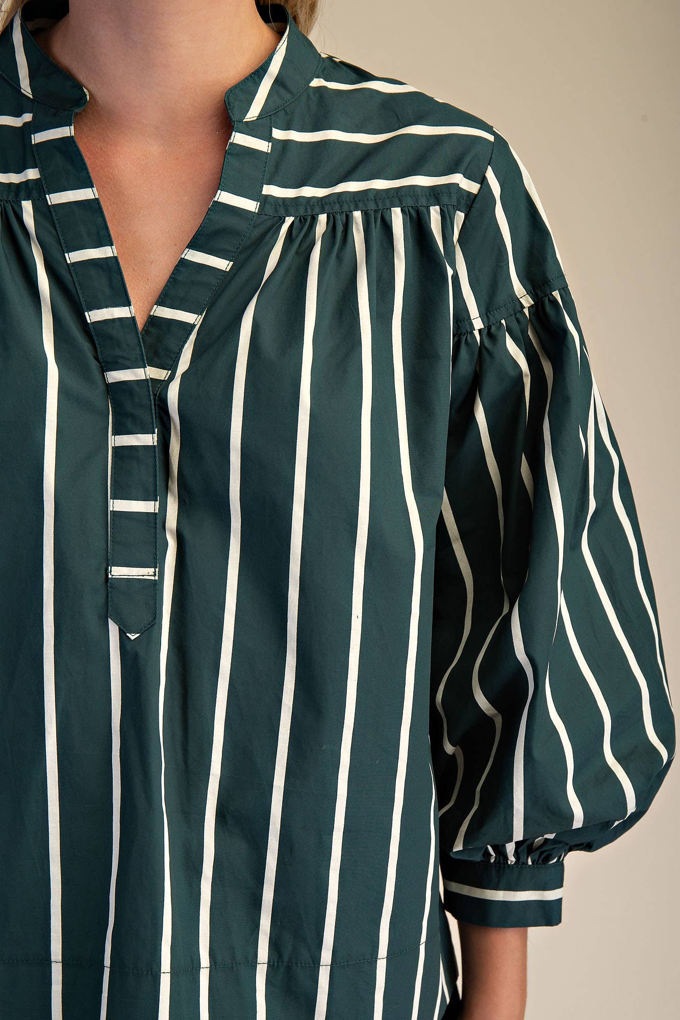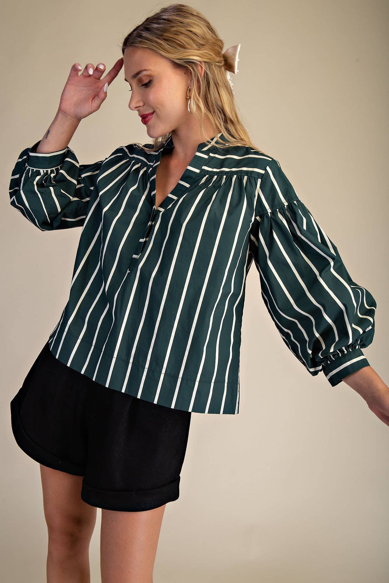 Long Puff Sleeve With Cuff V Neck Shirt Model Height: 5'8" Wearing Size Small