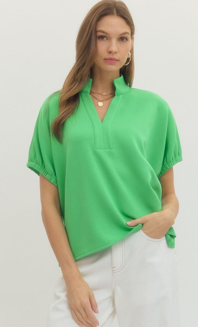 Striped short dolman sleeve top featuring contrast V-neck panel detail. Unlined. Woven. Non-sheer. Lightweight.