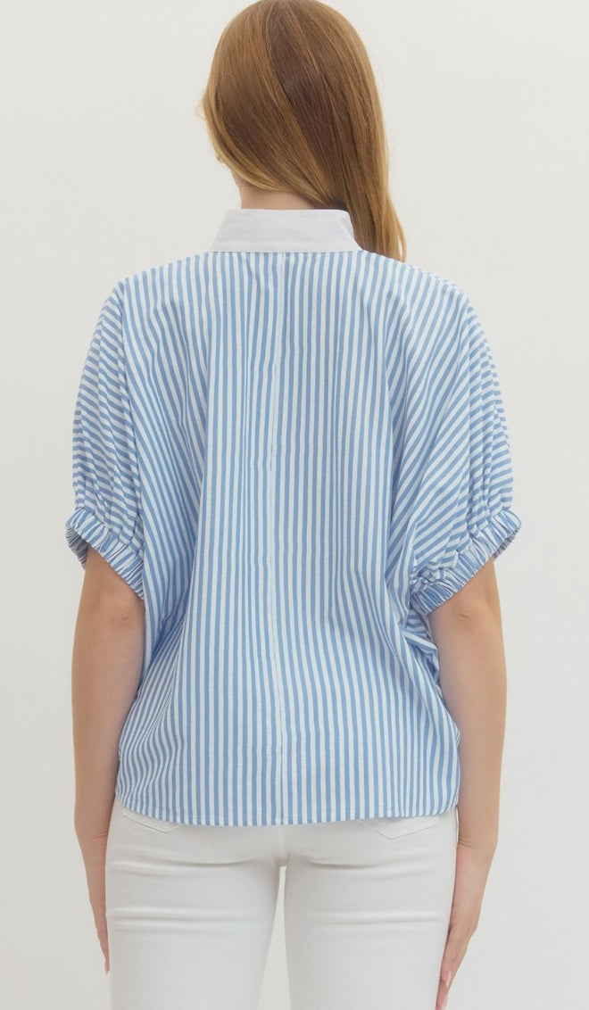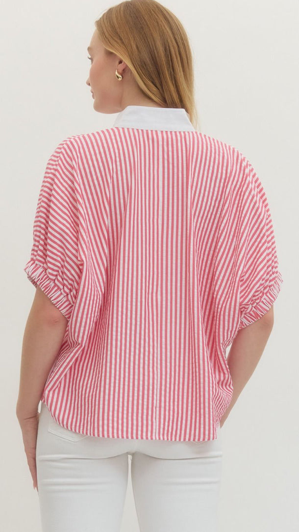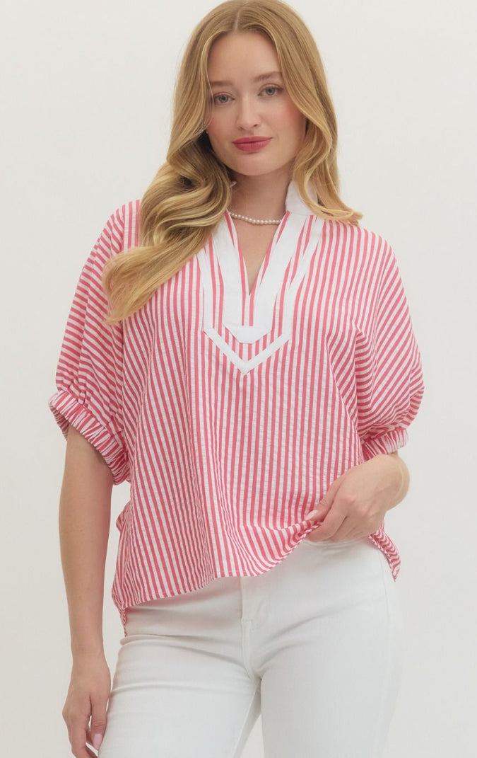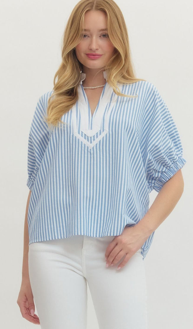 Striped short dolman sleeve top featuring contrast V-neck panel detail. Unlined. Woven. Non-sheer. Lightweight.