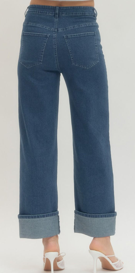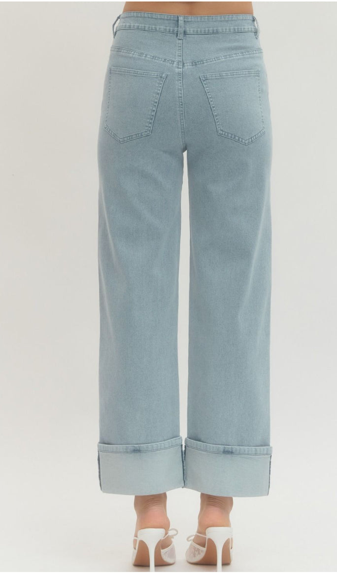 Solid wide leg pants featuring zip-fly button front closure and wide cuff hem. Side and back pockets. Unlined. Woven. Non-sheer. Lightweight.