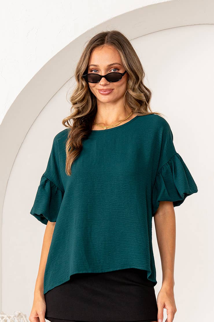 This textured top features short ruffle sleeves that add a playful, feminine touch to the clean silhouette. Designed with a round neckline and back keyhole with button closure, it's easy to wear and style. The lightweight fabric drapes effortlessly, making it a versatile piece for both work and weekend looks.