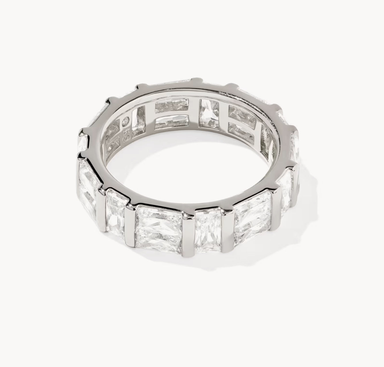 Delicate elegance is at your fingertips with the Jamie Silver Band Ring. Featuring bezel-set baguette crystal detailing and high-shine metal, this ring is a must-have for any occasion. Style it with the Jamie Hoop Earrings for a chic, coordinated ensemble.