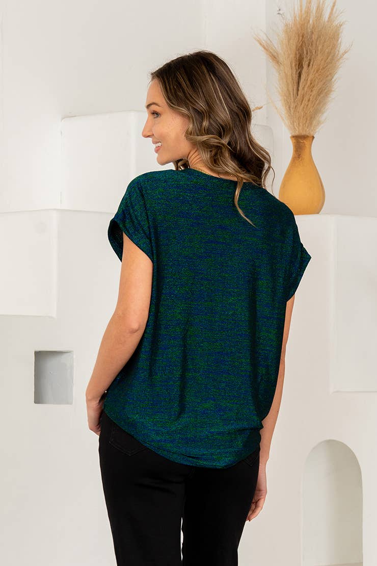 This top features cap sleeves and a relaxed, flowy fit for an effortlessly chic look. The subtle shimmer throughout adds a touch of glam, perfect for day-to-night styling. Made from soft, stretchy fabric, it drapes beautifully and feels comfortable all day long.